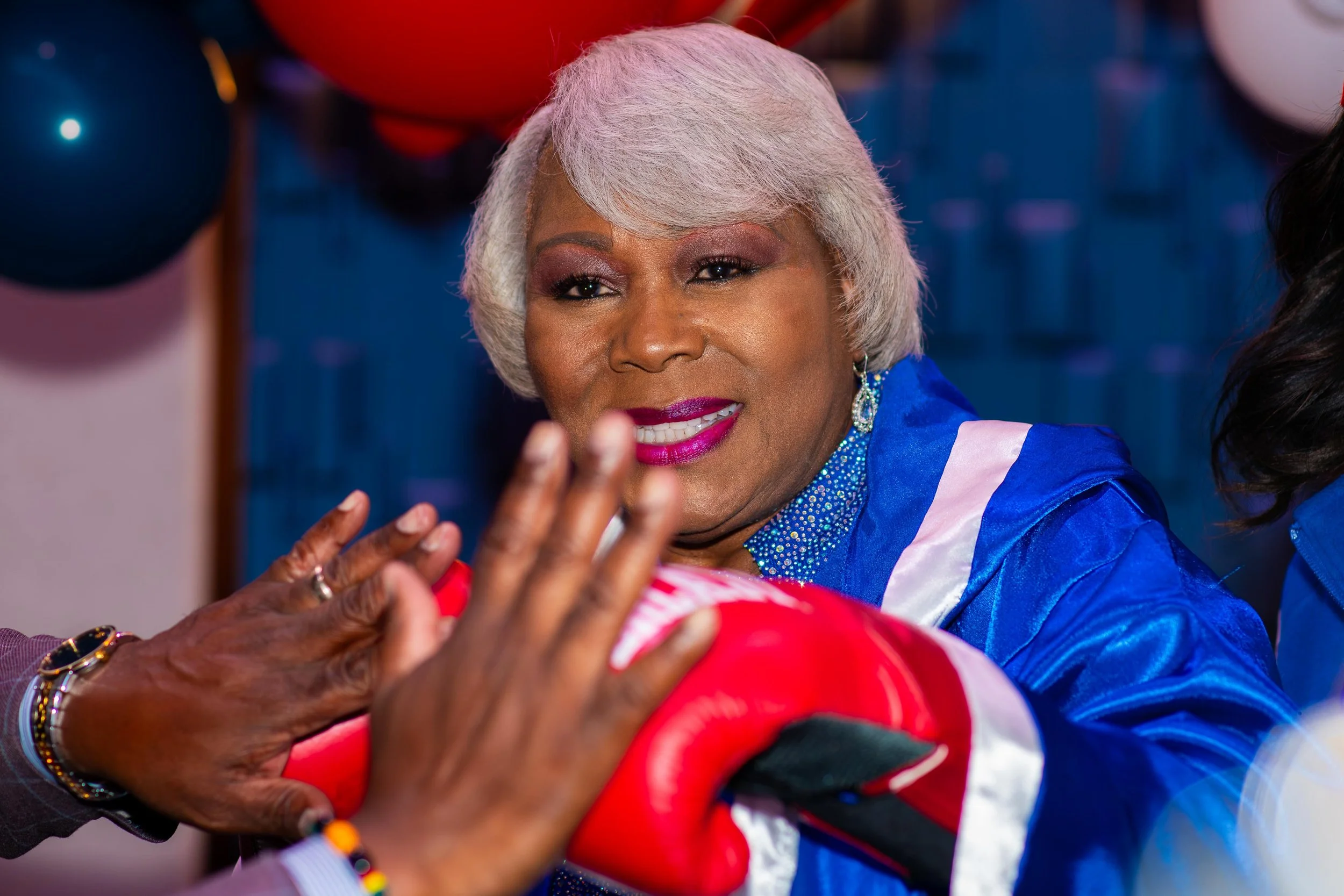 One of the most visually striking moments of the night came when Senator Lucas posed wearing boxing gloves—a symbolic, lighthearted representation of strength and resilience.