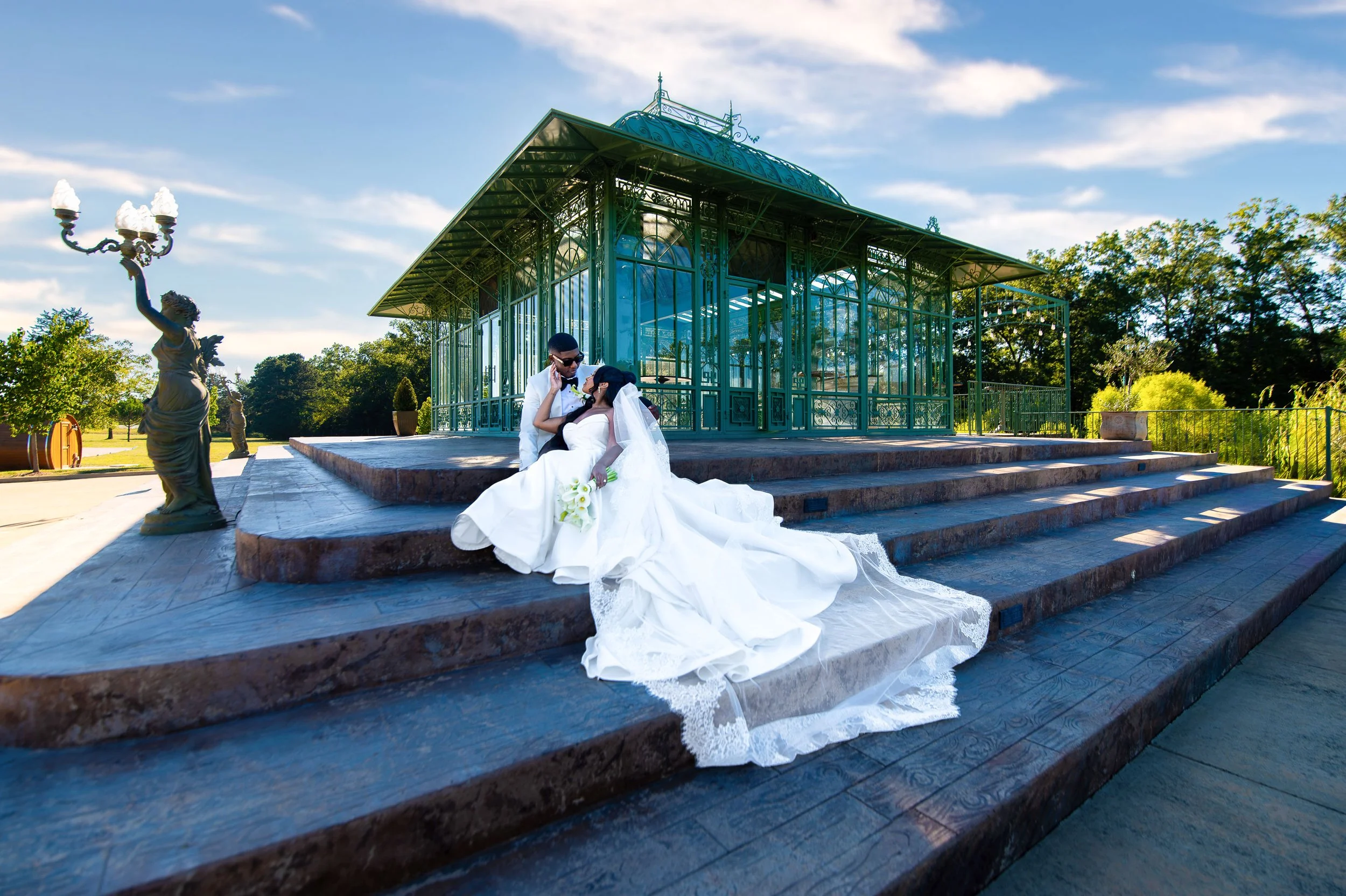 A bride and groom sitting on steps outside a glass-gazebo at Morais Vineyard and Winery in Bealton VA, with a bride holding a bouquet of white flowers, surrounded by statues and trees on a bright, clear day.